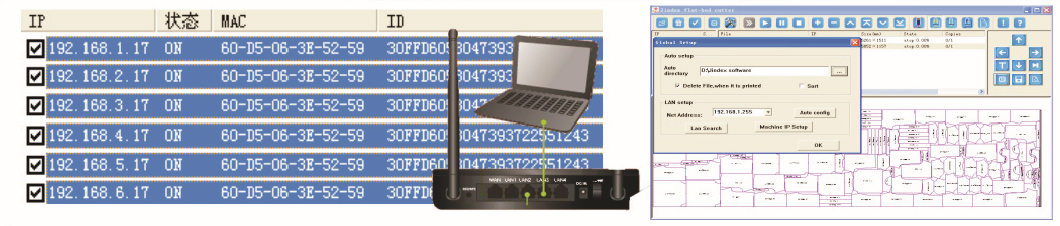 ⑥1. A PC computer controls multiple inkjet cutters through a router;2. The world's first super terminal cutting & drawing software, the terminal computer can preview and edit each queued file in the host computer;3. The host cutting and inkjet software communicates with the terminal software in real time, and it is not necessary to walk around between the computers when checking and editing the files in the inkjet cutting!