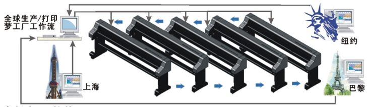 Cloud printing technology: a computer network control up to 50 inkjet machine printing at the same time, HPGLHPGPLTPRN and other files through the local area network or INTERNET free transmission, system free distribution printing, the establishment of your "global printing dream factory" immediately become a reality!
