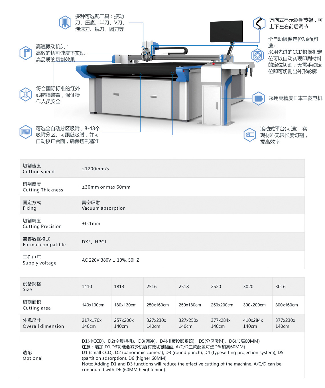 - It adopts advanced and mature rolling table design, the platform width can be customized size, the theoretical cutting length is unlimited, the use of vacuum suction design, super strong suction (small sample adsorption is no longer difficult);Automatic camera positioning function: automatically realize the positioning and cutting of printing materials. The contour can be cut without manual positioning.